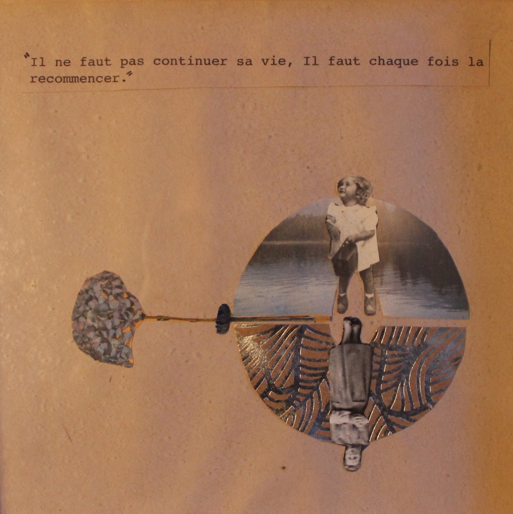 Comme l’indique le collage de mon amie, on peut recommencer sa vie, la réinventer. Cette invitation à la nouveauté est un leitmotiv pour moi, une manière de vivre et d’avancer. Recommencer, c’est une manière (parmi d’autres) de continuer.