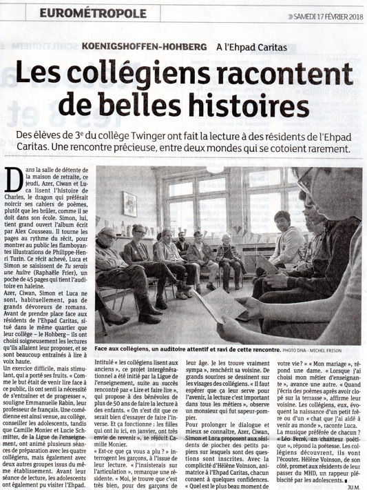 J’ai impulsé d’autres projets inter-associatifs mais aussi intergénérationnels, notamment un projet de soutien à l’apprentissage de la lecture avec le collège Twinger, toujours dans le même quartier. Un projet où les résidents et les collégiens se réunissaient autour de la lecture d’ouvrages choisis. J’ai été profondément marquée par la gentillesse réciproque qui émanait des rencontres et l’ouverture d’esprit dans ce quartier multiculturel : les enfants et les anciens ont échangé dans plusieurs langues et sur des sujets à l’apparence très éloignés.
