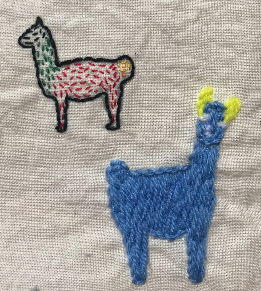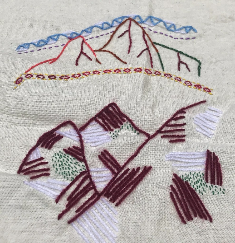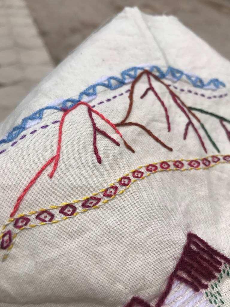 Toutes ces découvertes et ces énergies ont alimenté mon inspiration. Je me suis essayée à dessiner et à broder des montagnes, des lamas et des motifs inspirés des différents peuples de la culture Quechua. Je teste, je dessine, j’expérimente et je m’allège de l’attente de résultat. • Plusieurs motifs sont déjà griffonnés pour Marie Marcelle et je les partagerai à mon retour. •